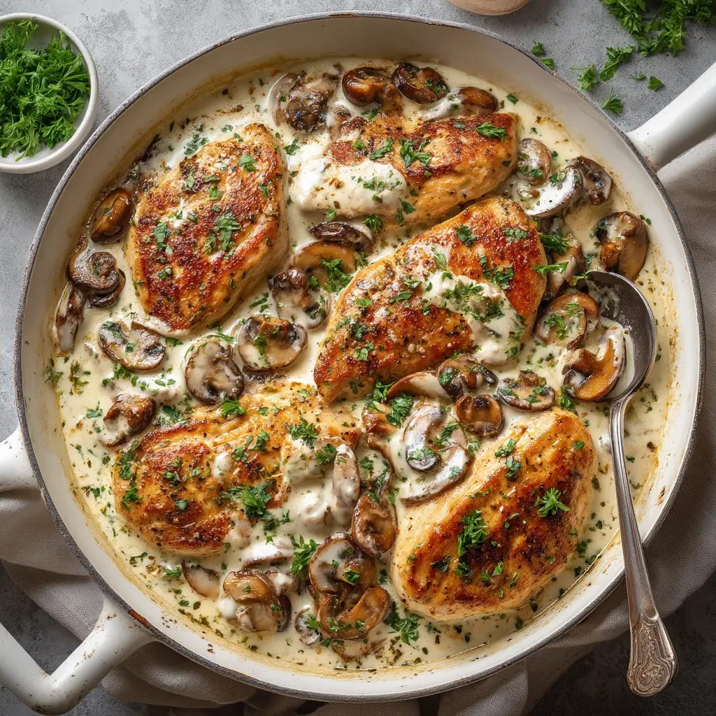 - Combine and Serve: Return the seared chicken breasts to the skillet, spooning the creamy sauce over them. Let them simmer in the sauce for a minute or two to heat through. Garnish with fresh parsley and serve immediately.