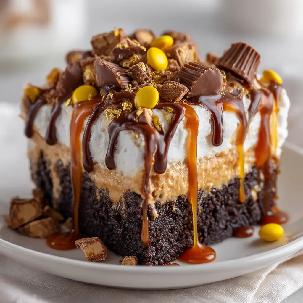 - Spread the whipped topping evenly over the chilled cake. Garnish with chopped peanut butter cups. Drizzle with chocolate or caramel sauce if desired.