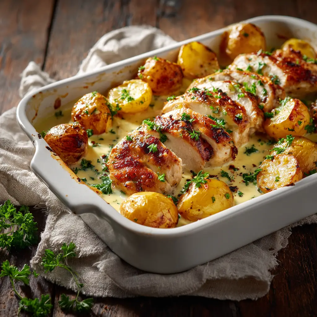 A close-up view of the finished creamy herb chicken and potato bake in a rustic baking dish, showcasing the golden-brown chicken and bubbling sauce.
