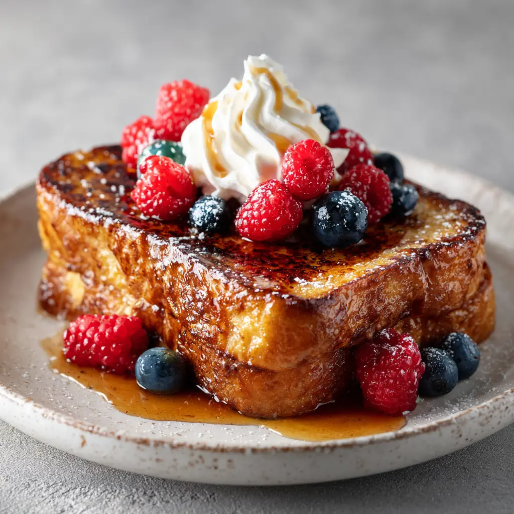 Imagine cutting into a thick slice of golden-brown brioche French toast sitting beautifully on a rustic white ceramic plate. The first thing you notice is the hard, glossy, torched caramelized sugar crust on top that cracks perfectly under your fork. It is an unforgettable sensory experience.