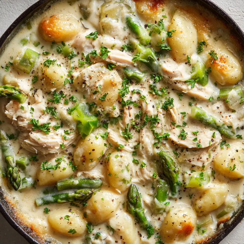 Once the gnocchi are plump and tender, return the cooked chicken chunks to the skillet. Gently fold in the 1 bunch (250g) of separately steamed asparagus pieces.