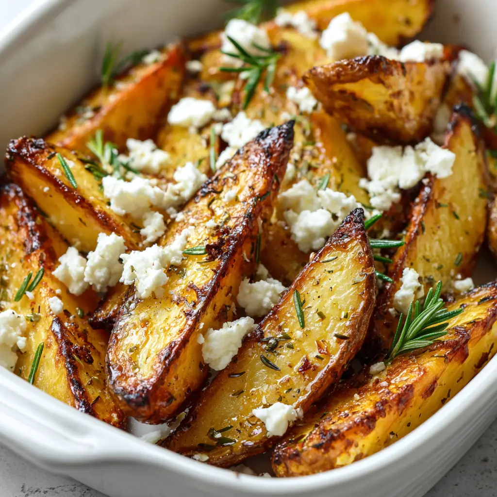 To finish the dish, we generously top the golden-brown wedges with crumbled white feta cheese and scatter them with chopped fresh green rosemary needles. The cool, creamy tang of the feta melts just slightly against the residual heat of the potatoes, while the piney rosemary adds a vibrant, earthy finish. Whether you are hosting a formal dinner party or enjoying a cozy family meal, these potatoes deliver unparalleled culinary satisfaction.