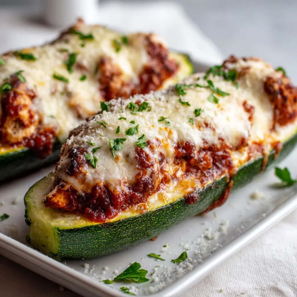 Picture this: fresh, tender green zucchini hollowed out and heavily stuffed with juicy chunks of cooked white chicken breast. Every bite is thoroughly coated in a rich, chunky dark red tomato marinara sauce that bubbles up around the edges. We bake them in a classic white rectangular ceramic baking dish until the mozzarella cheese blanket turns into a stringy, slightly charred masterpiece. Top it all off with a delicate dusting of grated parmesan and finely chopped fresh green parsley, and you have a show-stopping weeknight dinner.