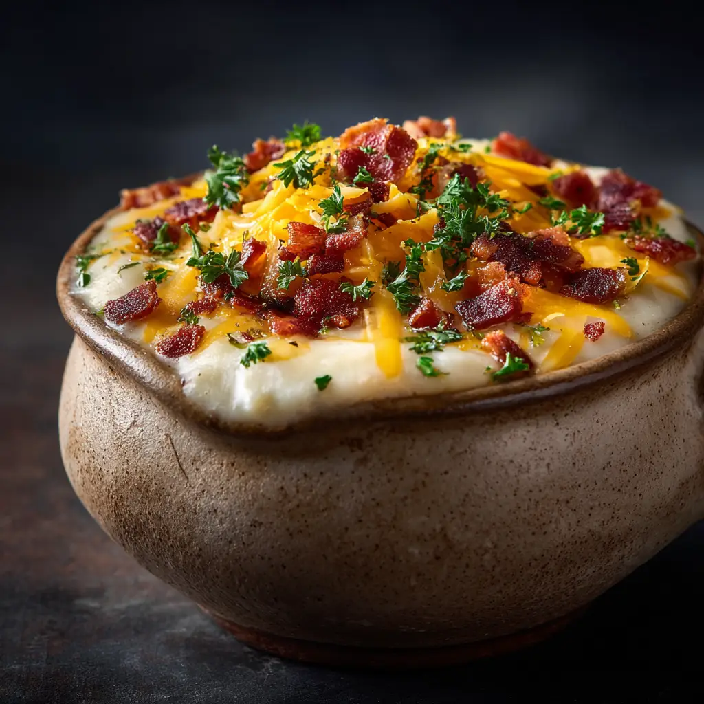 Think of it as a loaded baked potato! The best toppings include crispy bacon, shredded sharp cheddar cheese, sliced green onions or chives, and a dollop of sour cream. Croutons or oyster crackers also add a nice crunch.