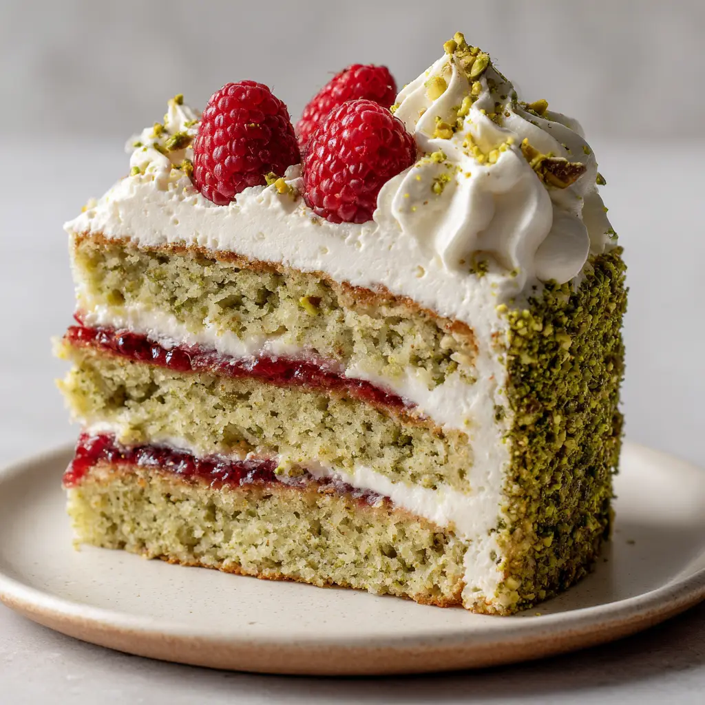 To build impressive vertical height, this beautiful sequence repeats twice more, creating a structurally sound, triple-stacked masterpiece. The crowning glory features a generous swirl of white whipped cream, meticulously decorated with three whole, fresh, plump red raspberries and a rustic dusting of coarsely crushed, vibrant green pistachio nuts. Whether you are hosting an elegant dinner or an afternoon tea, this Pistachio Raspberry Layer Cake delivers an unmatched, sensory-rich experience.