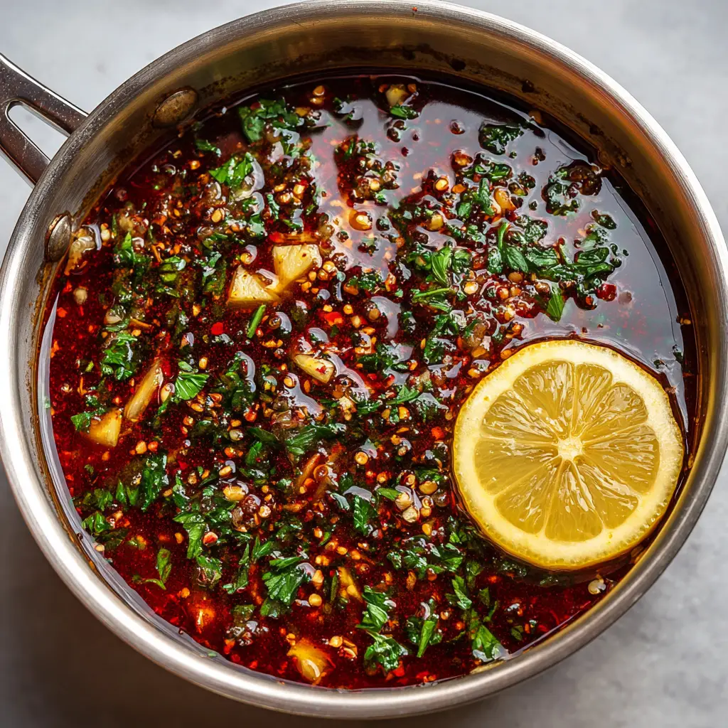 - Turn off the heat. Drop the thick-cut fresh lemon wedge into the edge of the sauce. Scatter the vibrant freshly chopped green parsley throughout. Stir gently and serve warm.